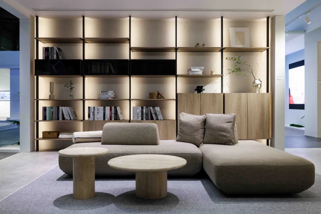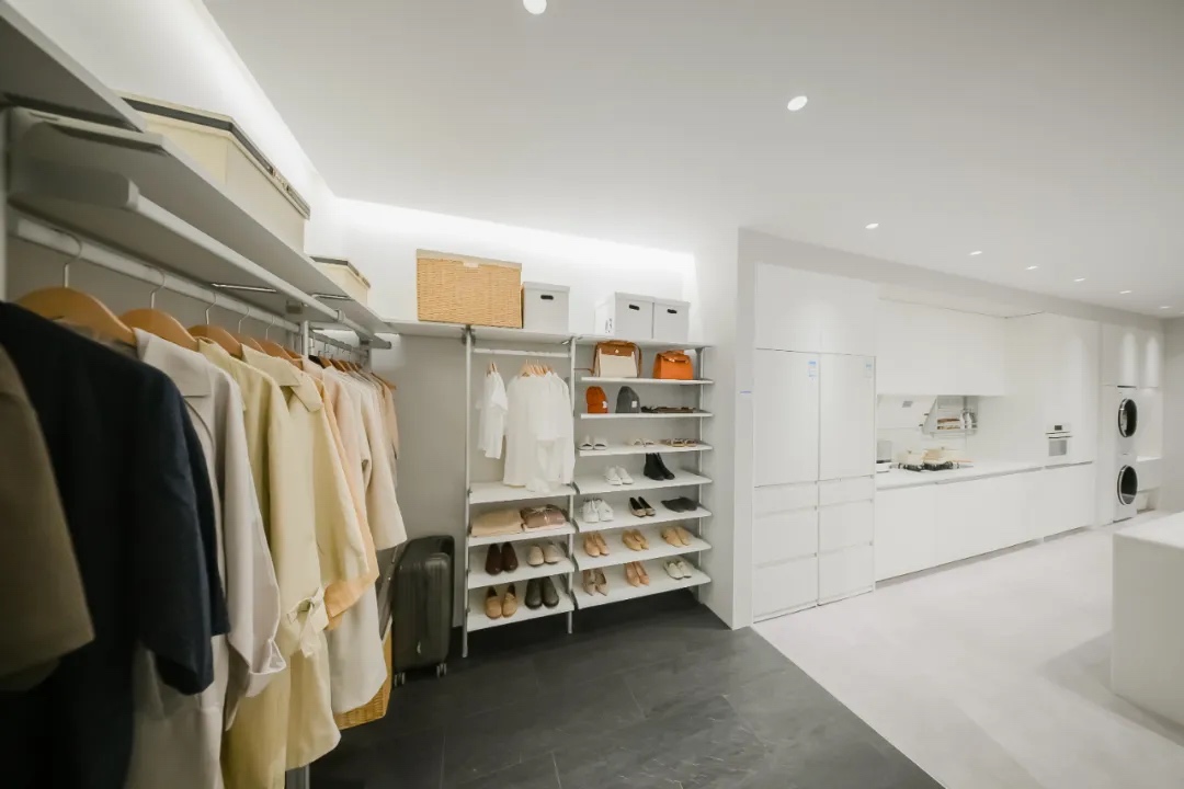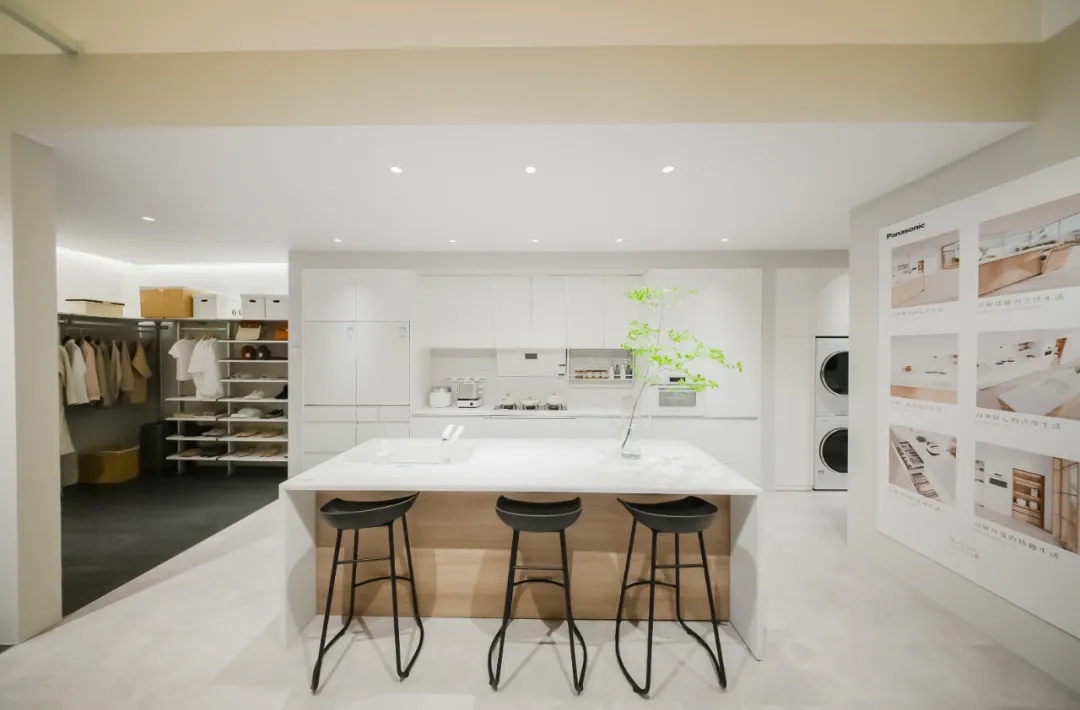 01 空间改善生活: 陪伴人生的每一次改变 住空间板块以 “陪伴人生的每一次改变”为理念,发挥松下在产品、设计与技术方面的优势,为两种不同人生阶段的家庭结构,提供定制化解决方案,支持居住者更健康、长久、自立的生活。 针对年轻的三口之家,既要促进全家人的交流,也要为个人的宁静留出空间。厨房以开放式布局为核心,搭配岛台设计优化烹饪动线,让亲子协作料理成为家庭日常。客厅以移门隔断灵活切换场景,既能成为全家人共同阅读、享受亲情时光的空间,也能分隔出享受个人放松时光的小天地。