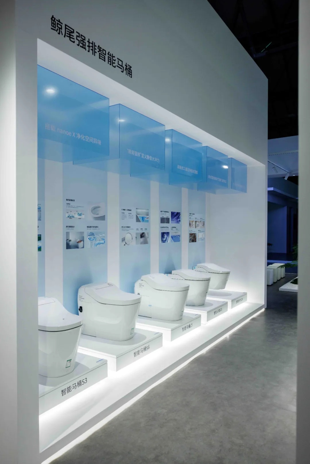 01 从理念到展品: 科技重塑卫浴体验 如何将抽象的“五感舒适”转化为可感知的体验?针对老龄化社会与年轻家庭的双重需求,鲸系列智能马桶搭载“鲸尾强排技术”,以10米超长移位覆盖卫生间改造痛点,配合“动力回旋泡”360°泡沫冲水系统,结合NanoeX空间除菌科技,实现“如厕零触感,洁净无死角”——泡沫防溅持续隔臭,让洁净从“物理清洁”进阶为“无感守护”。而原装进口整体浴室L-CLASS系列则以Sugopika材质采用无缝设计,易清洁,不易渗漏,彻底消除漏水发霉隐患;磁吸式收纳设计,可根据个人的习惯随手取放,晶泽浴室柜的插拔式收纳盒简化清洁流程,无影导光镜柜兼顾实用与氛围美学。YUKI系列三分离设计中整体浴室SR更通过磁吸墙板与纳米保温层技术,在还原日式汤浴禅意的同时,适配中国家庭干湿分区习惯,让传统沐浴智慧与现代生活场景无缝衔接。
